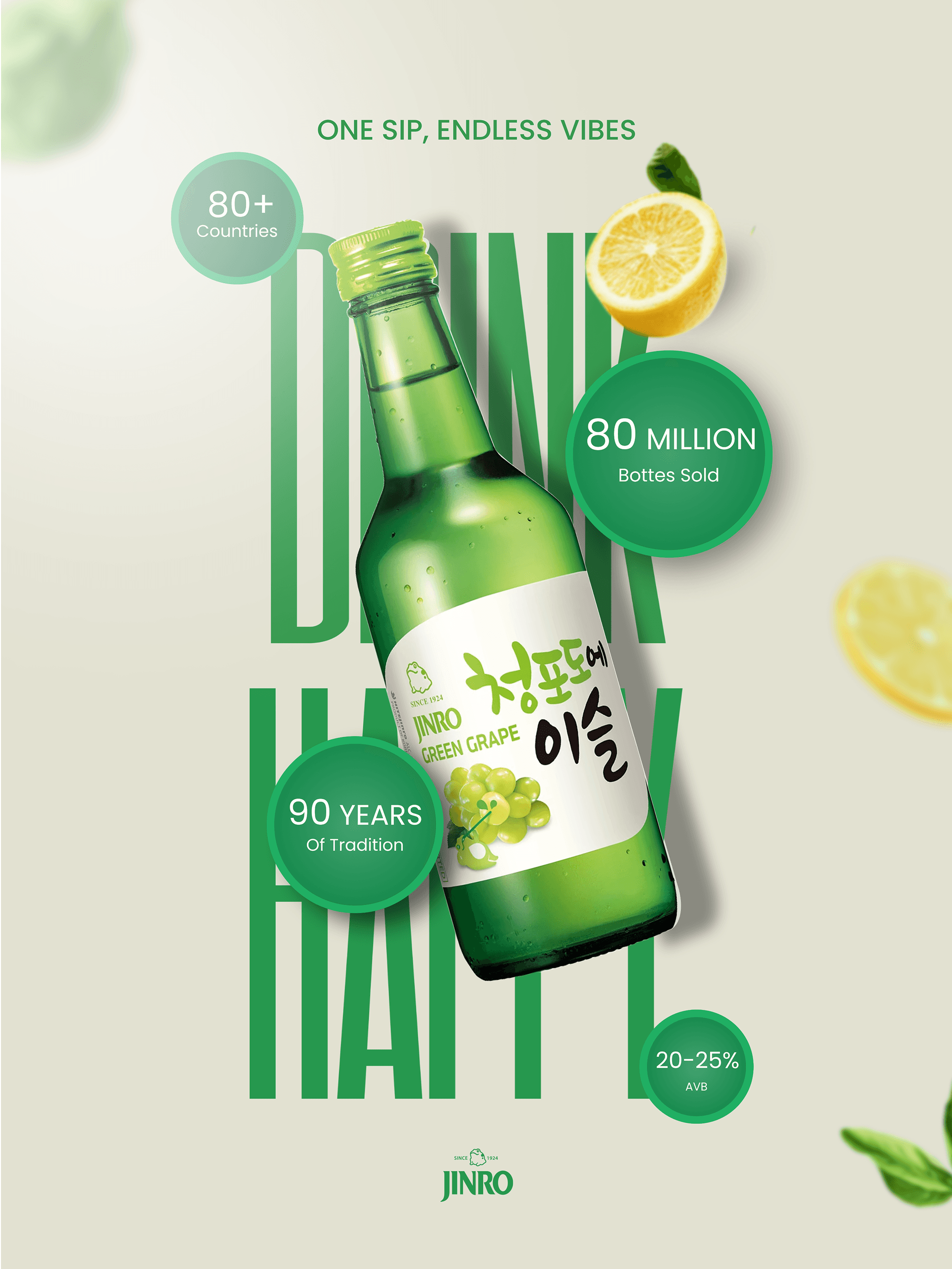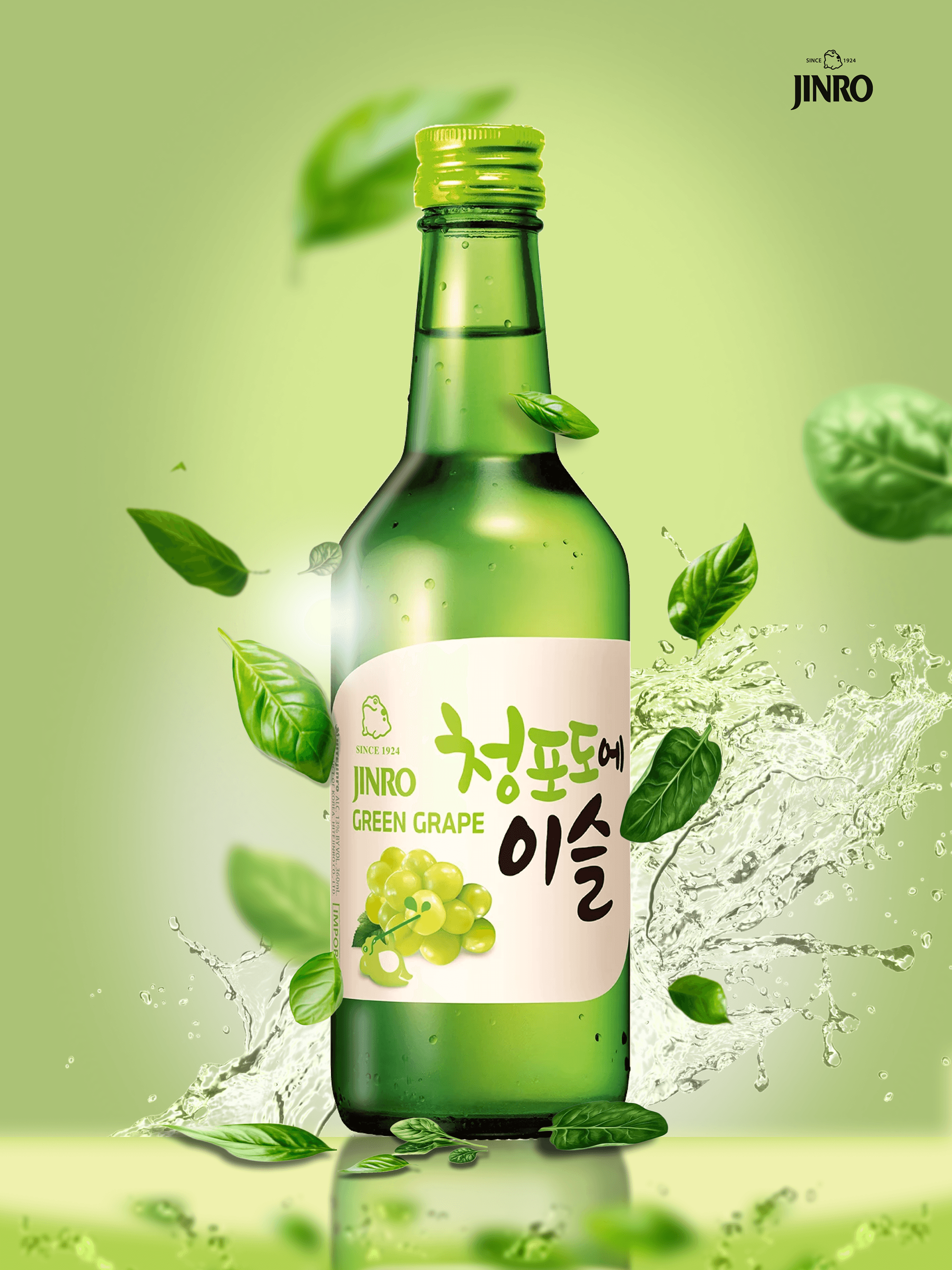 Promotional poster highlighting Jinro Green Grape’s global presence with bold typography and product emphasis