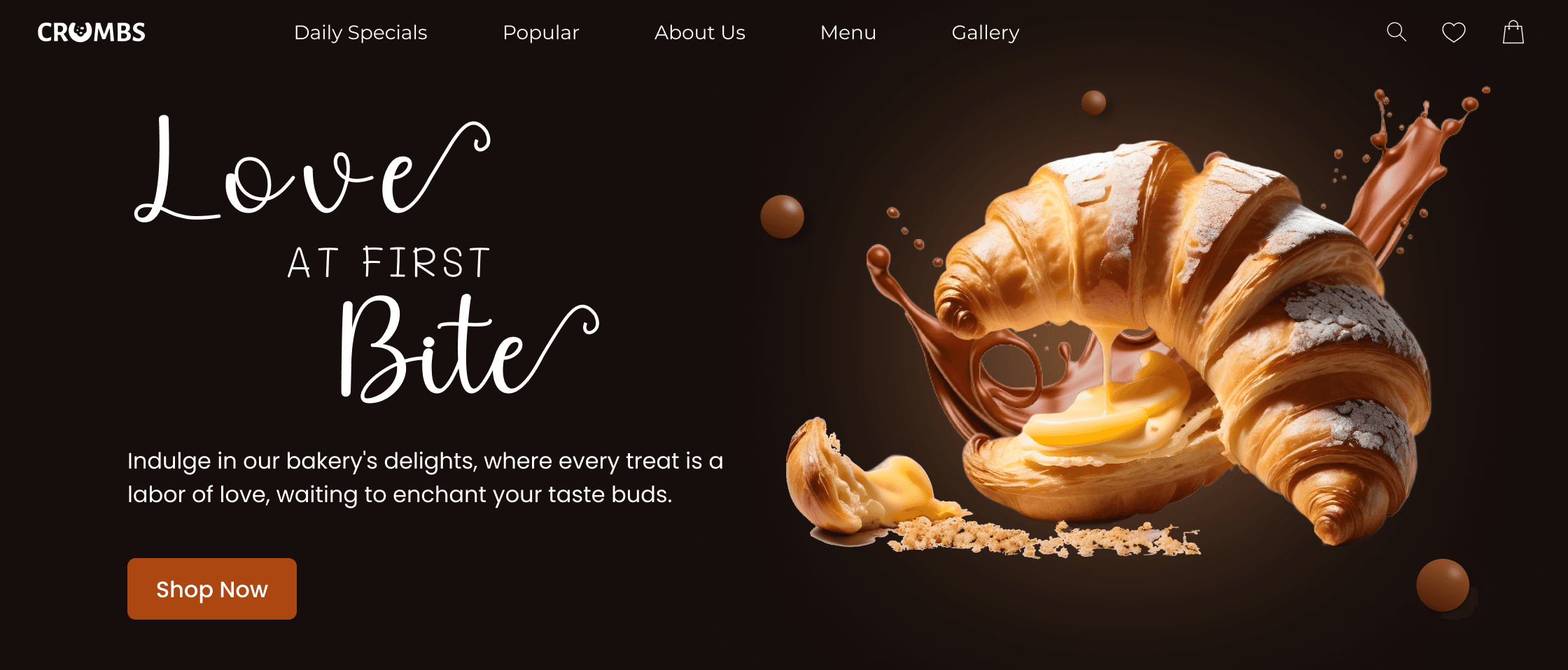 A dark themed landing page for Crumbs Bakery, using glassmorphism and visual first design to showcase handcrafted baked goods.