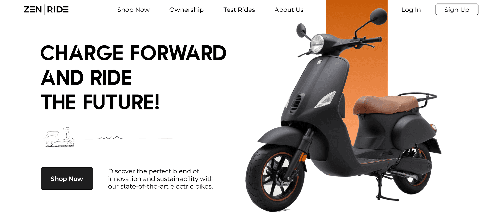 ZenRide is a clean, modern landing page designed to showcase a premium e-bike with smooth visuals, smart layout, and a focus on effortless urban mobility.